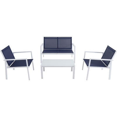 The Harper 4-Piece Sling Seating Set is a sleek and modern outdoor furniture collection designed for comfort and style. This set includes two chairs, a love seat, and a coffee table, all made with durable materials that can withstand outdoor elements. The seating features a breathable sling fabric, providing comfort and support. The coffee table is the perfect size for placing drinks and snacks, making it easy to entertain guests. The Harper 4-Piece Sling Seating Set has a minimalist design with a white and gray color scheme that adds a touch of sophistication to any outdoor living space. It's a must-have for those who appreciate contemporary design and value outdoor relaxation.